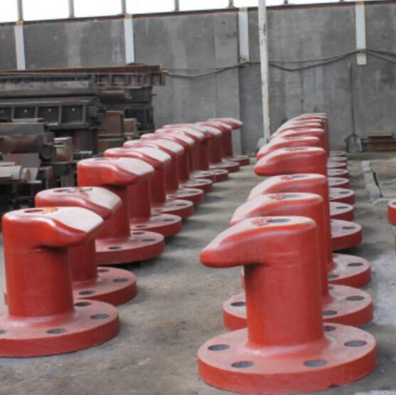 Cast-iron Tee Head bollards, 10 to 300 tonnes as standard, treated against corrosion with epoxy paint. Lugs under the anchoring plate reinforce the bollard`s hold on the quay. The bollard is anchored with straight tie-rods embedded in the concrete of the quay.