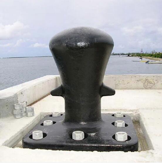 Cast-iron Tee Head bollards, 10 to 300 tonnes as standard, treated against corrosion with epoxy paint. Lugs under the anchoring plate reinforce the bollard`s hold on the quay. The bollard is anchored with straight tie-rods embedded in the concrete of the quay.